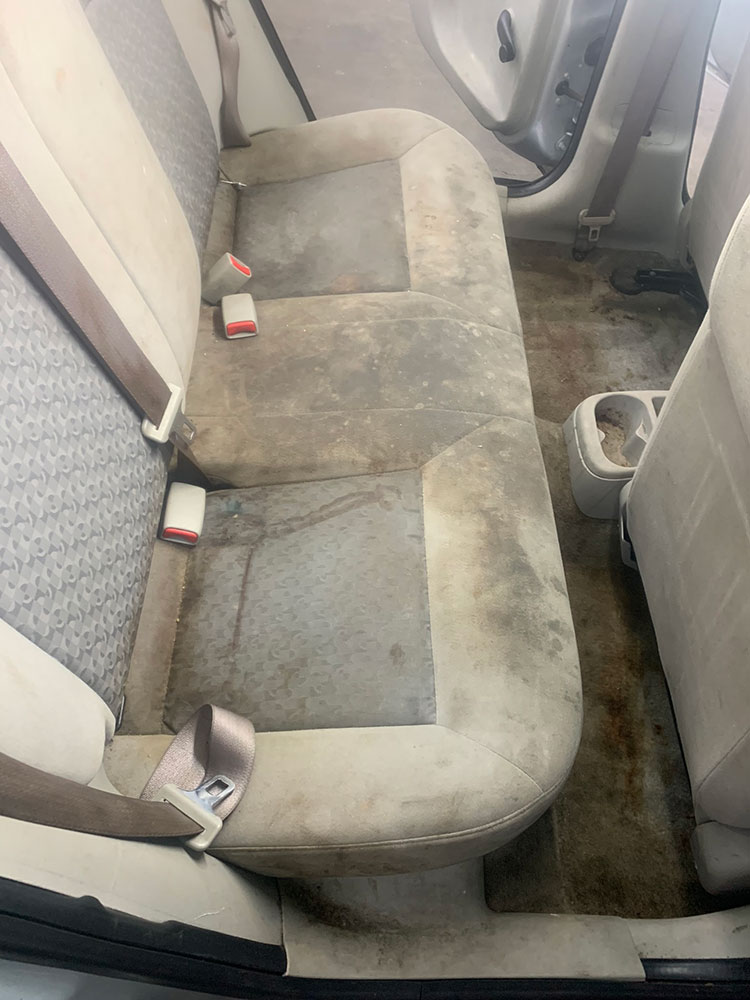 This car’s interior was filthy before we got to work on it. Here one of our team members is beginning the cleaning process on the driver’s seat: